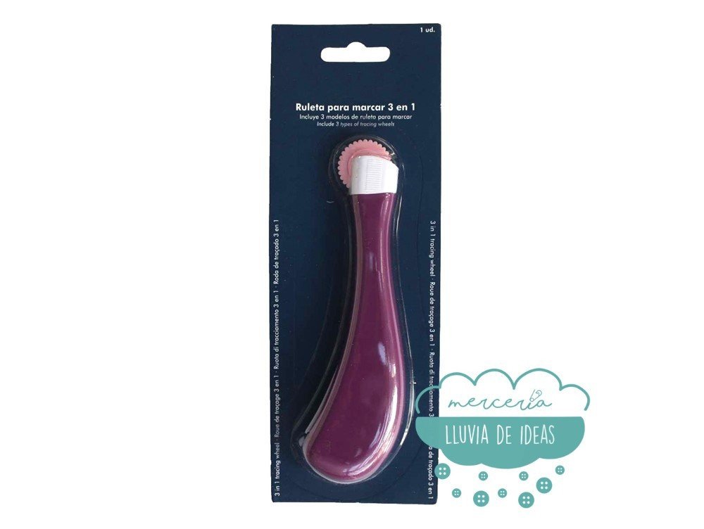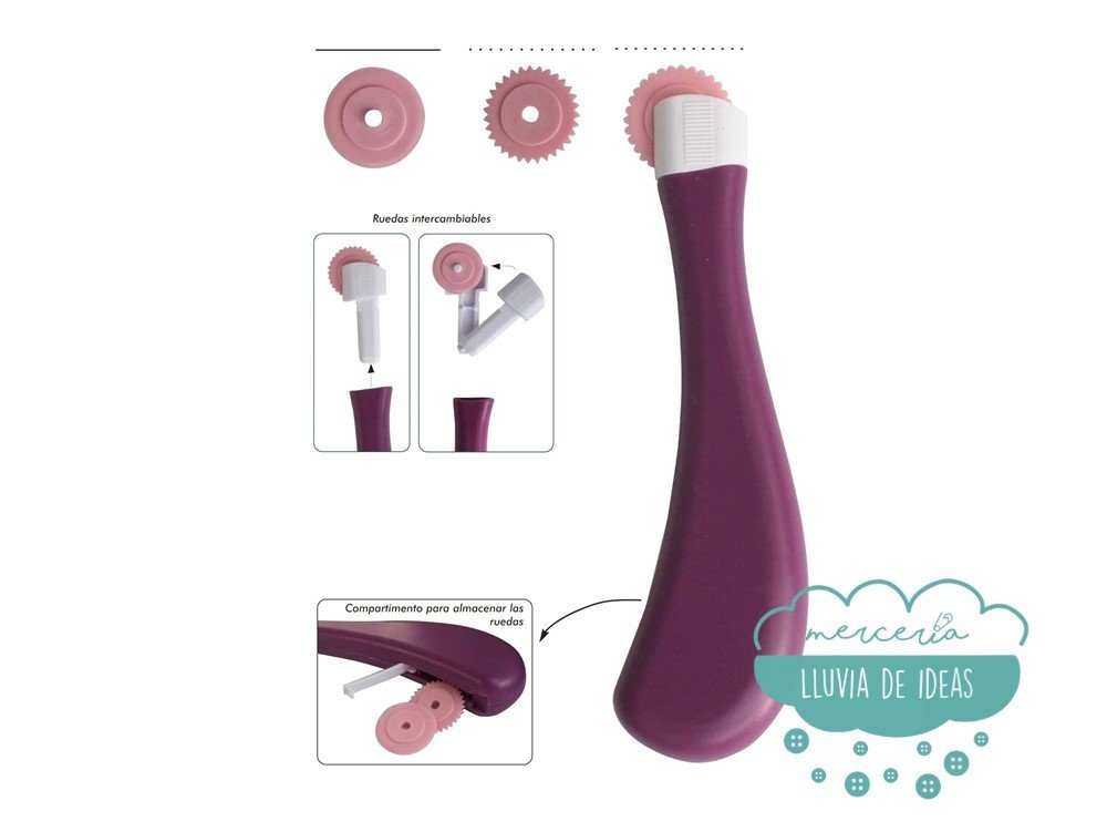 Ruleta para marcar patrones en tela con mango y púas plásticas. Transfiere patrones sobre tejidos con los diferentes tipos de rodillo. Incluye 3 ruedas intercambiables. Compartimento en el mango para almacenar las ruedas que no se empleen.