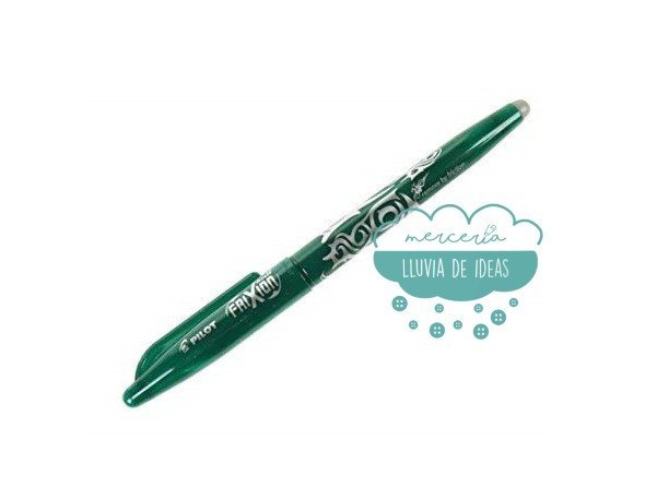 Rotulador Pilot Frixion con punta de bola en color verde. Su tinta desaparece mediante un novedoso sistema de fricción y también reacciona a temperaturas elevadas, donde desaparece el pigmento de la tinta. Ideal para todos tus proyectos: patronaje, patchwork, bordados, etc. Incorpora goma en su capuchón para facilitar la eliminación de la tinta. También se elimina mediante planchado.