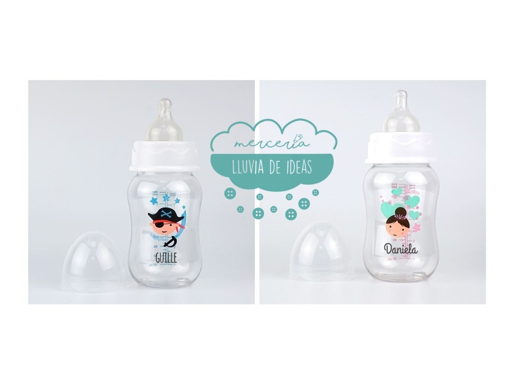 Biberones personalizados con estampación de hada o pirata. (PERSONALIZADO EN LA ROSCA A DIFERENCIA DE LA FOTO)