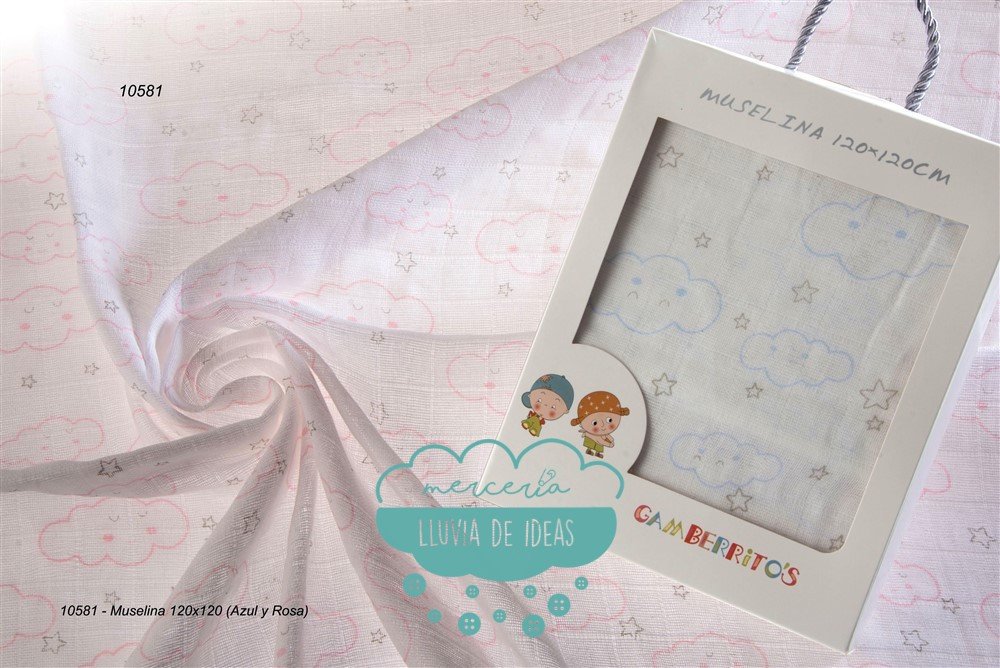 Muselina estampada o gasa de algodón. Artículo muy práctico gracias sus múltiples usos: a modo de mantita o arrullo en primavera/verano, como gasas absorbentes, pañales, a modo de toalla, quitapenas cuando duerme, como cubierta protectora de sol directo (recuerda que no protege de los rayos directos) o contra insectos en el carrito, etc.
