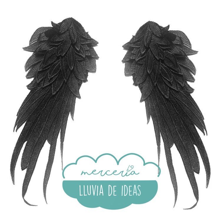 Aplicación bordada con forma de alas de ángel en color negro (tipo guipur). Cada ala consta de 7 capas superpuestas que aportan volumen. Medida: ancho 14 cm. x alto 28 cm. aprox. Permite la customización de prendas. Se pueden coser o pegar. Colócalas a modo de hombrera, a la espalda (imitando las alas de un ángel) o en el frente. El precio se refiere al par. Tipo espejo.