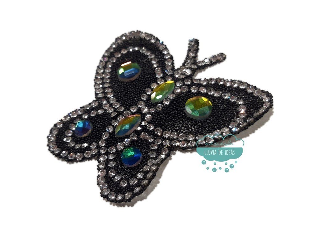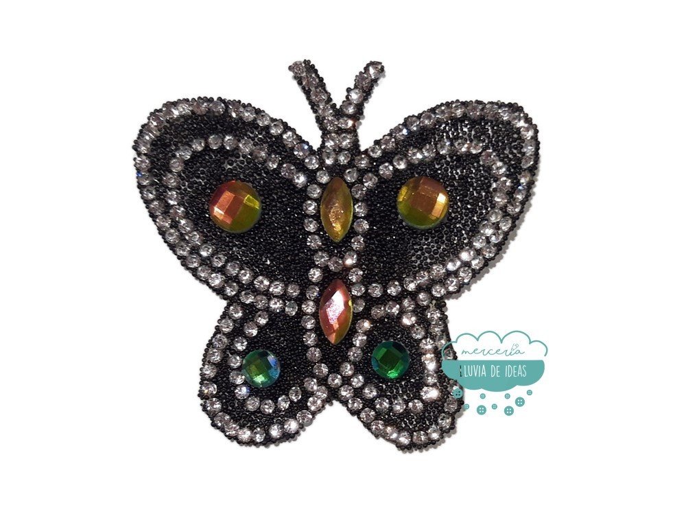 Aplicación termoadhesiva con forma de mariposa con cristales y piedritas para pegar que permite la reparación y customización de prendas. Según la incidencia de la luz, las piedras cambian de color. Medida: ancho 6 cm. x alto 6 cm. aprox. El precio se refiere a la unidad.