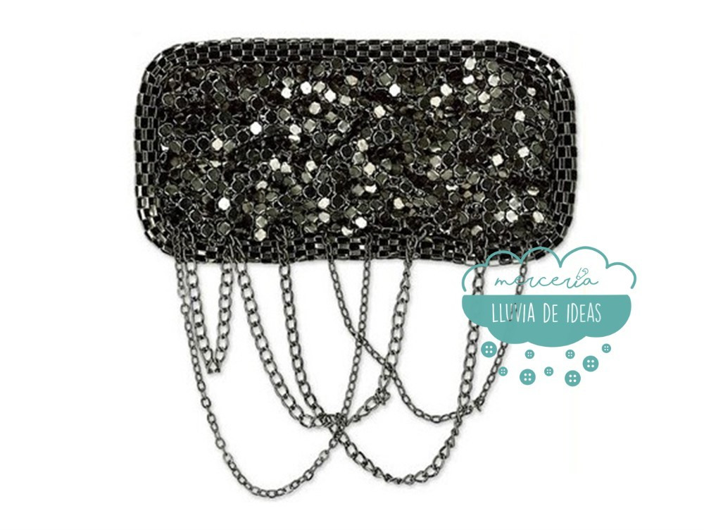 Aplique principalmente destinado para hombros con cadenas y tejido metálico. Permite la reparación y customización de prendas. Los elementos decorativos están colocados sobre una base de fieltro negro. Se pueden coser o pegar con pegamento textil.