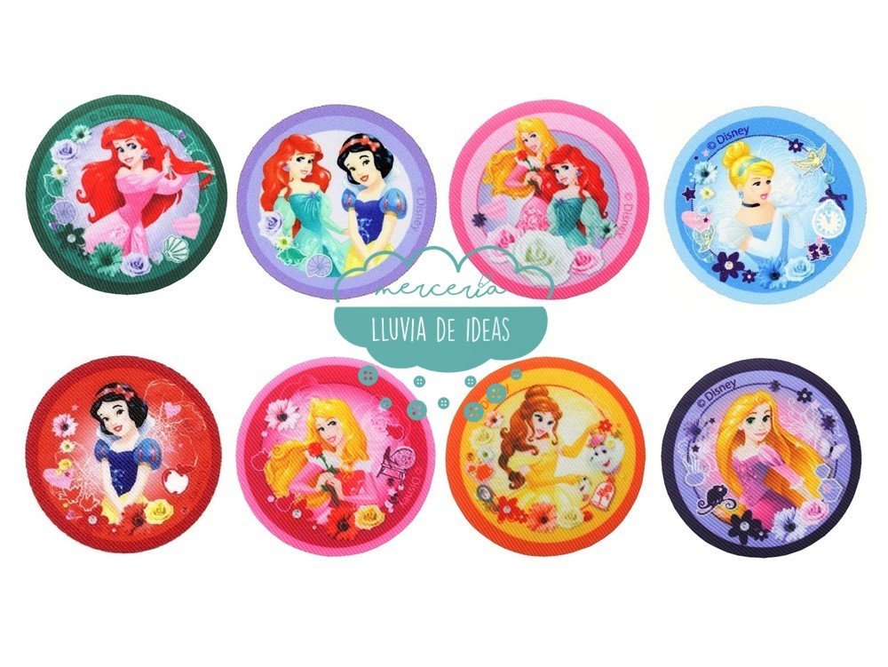 Parche serigrafiado termoadhesivo circular con estampación de princesas Disney, que permite la reparación y customización de prendas en segundos.