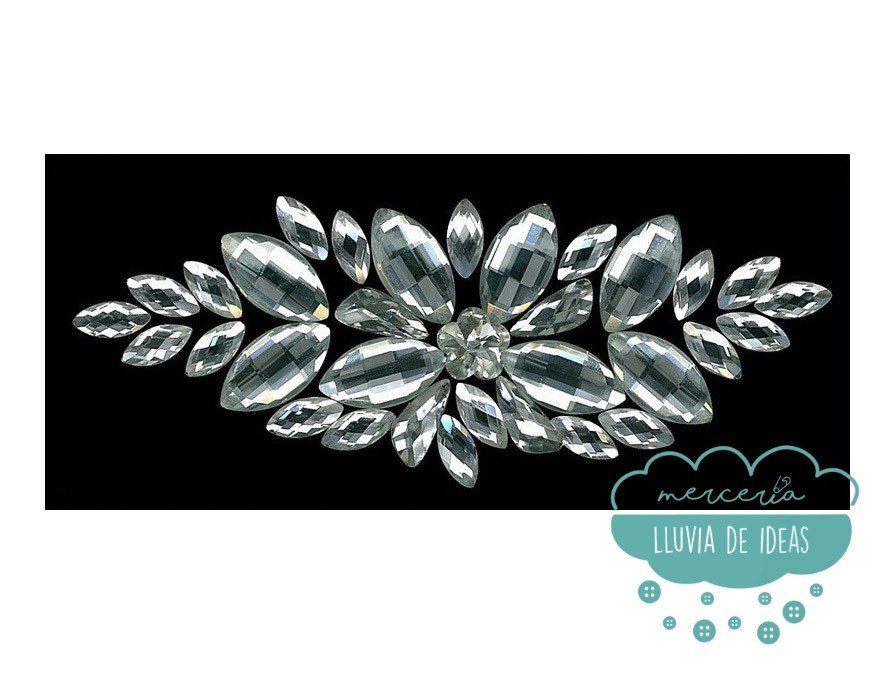 Aplique con piedras en forma ovalada con flor central para pegar que permite la reparación y customización de prendas. Ideal para novia y vestidos de fiesta. Puede colocarse en la parte central del vestido, a modo de cinturón o sobre los hombros, zona del escote, etc. Referencia: 752021. Tamaño: ancho 15,5 x alto 6,5 cm. aprox. El precio se refiere a la unidad.