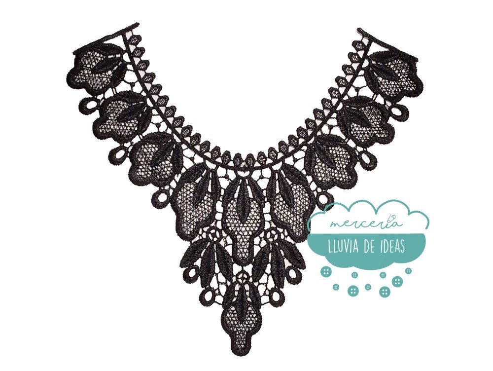 Aplicación bordada guipur tipo cuello para coser o pegar que permite la reparación y customización de prendas. Ideal para decorar cualquier tipo de tejido en camisas, camisetas, vestidos, etc. Muy empleado en kaftanes y casacas. Referencia: 05152. Composición: 100% poliéster. Medida: ancho 30,5 cm. x alto 29,5 cm. aprox. Se recomienda lavarlo previamente en agua tibia y sal antes de su colocación en la prenda. El precio se refiere a la unidad.