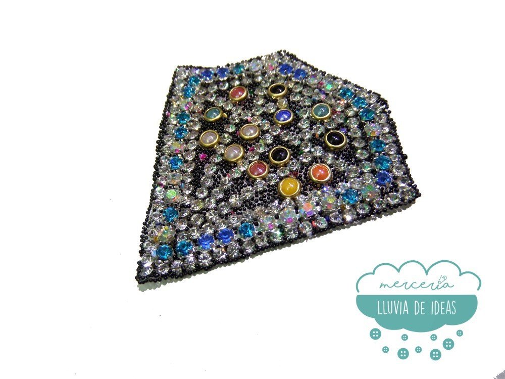 Aplicación termoadhesiva con rocalla, cristal y tachuelas de perlas multicolor para pegar que permite la reparación y customización de prendas. Medida: ancho 5,8 cm. x alto 5,5 cm. aprox. El precio se refiere a la unidad.