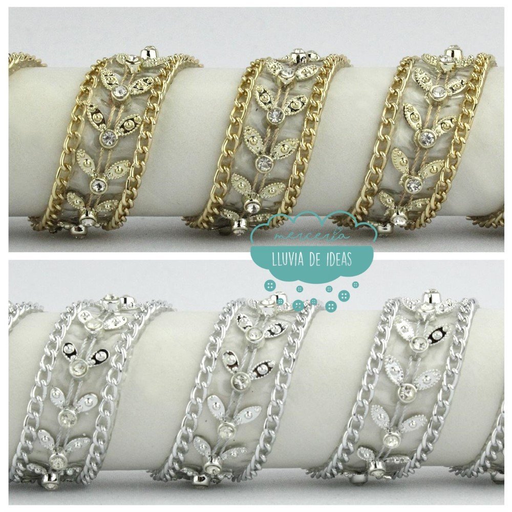 Tira metálica termoadhesiva que incluye cadenas laterales y adornos metalizados con forma de flor y detalle de cristal. Ideal para decoración o customización de prendas y accesorios en general. Le ayudará a conseguir detalles glamurosos y mucha luz. La confección de este material es sencilla y aporta mucho brillo, relieve y algo de textura. Este modelo es termoadhesivo (se adhiere mediante la aplicación de calor con una plancha).