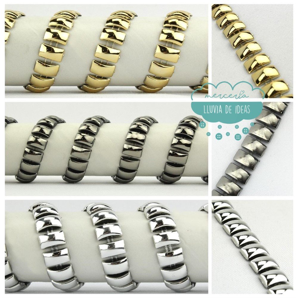 Pasamanería tipo cadeneta en PVC con relieve. Presenta una forma rectangular pero ligeramente abombada que proporciona un suave relieve. Este material es de sencilla confección; la sujeción puede ser por puntadas de aguja, silicona, pegamento textil o incluso puede trabajarse suelto. Sus usos más comunes son como remate y adorno de confección en general, trajes de carnaval, trajes para comparsas o confecciones de vestuario, sin embargo puede usarse como adorno en decoración o incluso en tapicería.