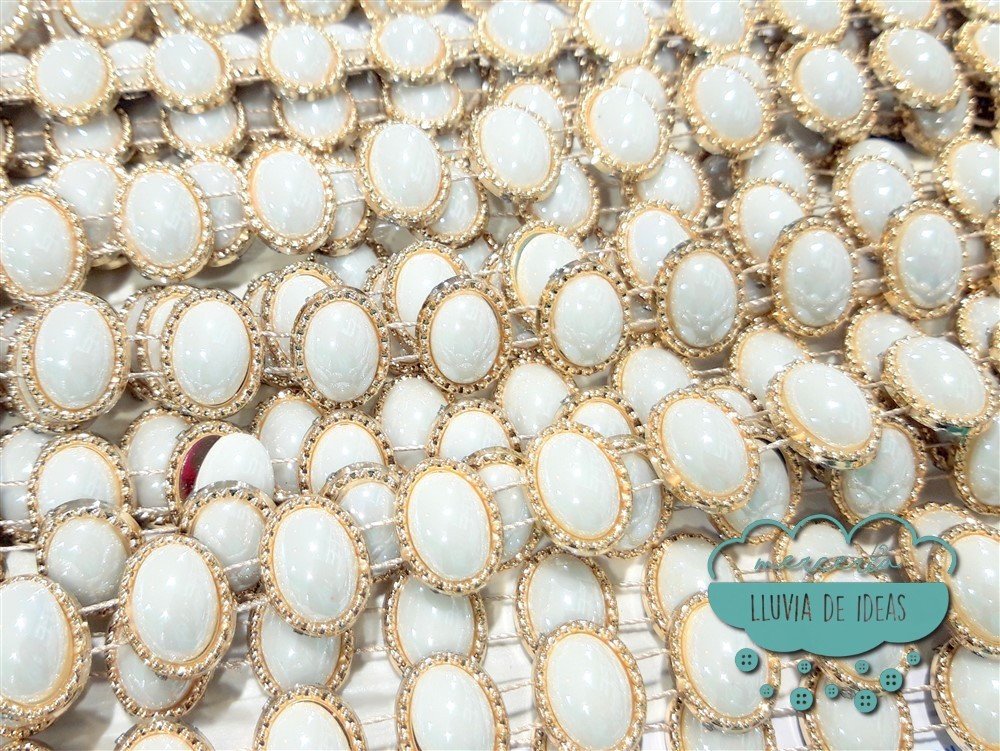 Pasamanería tipo cadeneta en PVC con perlas brillantes ovaladas y contorno dorado. Es ideal para personalizar tus prendas de fiestas, trajes de carnaval o vestidos de fantasía. Este material es de sencilla confección; la sujeción puede ser por puntadas de aguja, silicona, pegamento textil o incluso puede trabajarse suelto. Sus usos más comunes son como remate y adorno de confección en general, trajes de carnaval, trajes para comparsas o confecciones de vestuario, sin embargo puede usarse como adorno en decoración o incluso en tapicería.