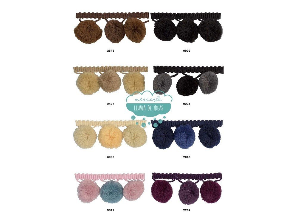 Fleco de pompones de tamaño medio. Ideal para customizar bolsos, capazos, toallas, cazadoras, cardigans, foulares, etc.
