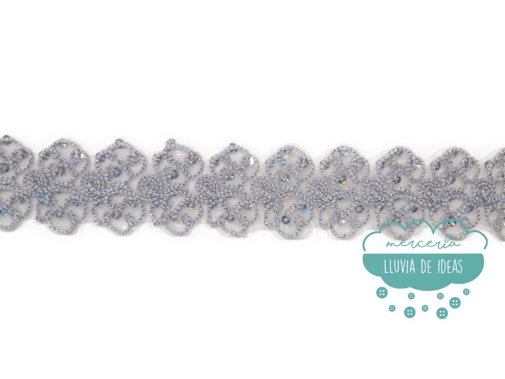 Pasamanería termoadhesiva con cordón decorado con hilo de lúrex y lentejuelas holográficas. Aporta brillo y luminosidad a tus confecciones. Referencia: X73. La base es una gasa rígida en color blanco. Ancho: 45 mm. aprox. Composición: 100% poliéster. El precio se refiere al metro lineal. El corte mínimo son 0.25 m. y a partir de ahí, en incrementos de 5 cm. (0.30, 0.35, 0.40...).