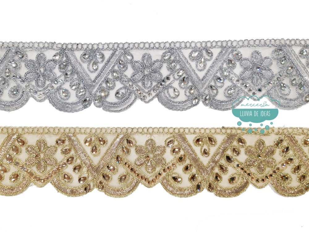 Pasamanería metalizada con pedrería y flores bordadas con hilo de lúrex. Aporta brillo y luminosidad a tus confecciones.