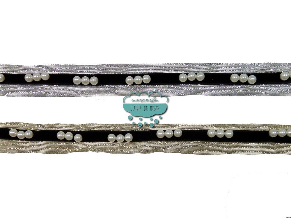 Pasamanería o cinta metalizada tipo yute con cinta interior de terciopelo en tono negro. Está decorada además con grupos de 3 perlas remachadas. Muy empleado en confecciones de fiesta. Añade brillo y luminosidad a tus confecciones.
