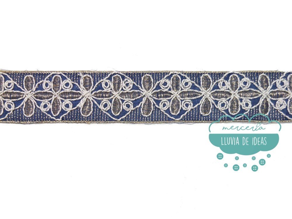 Galón sobre tejido vaquero de grosor fino. Combina cordón blanco roto e hilo plata creando diferentes formas, con bordado dorado en hilo de lúrex a lo largo de toda la cinta y empleado en el remallado de sus orillos. Aporta originalidad y mucha vida a tus creaciones. Perfecta tanto para usar en vertical como en horizontal. Se puede emplear para reparar o customizar todo tipo de prendas. Referencia: 981154. Ancho: 5,5 cm. aprox. Composición: mezcla de algodón y poliéster. El precio se refiere al metro lineal. El corte mínimo son 0.25 m. y a partir de ahí, en incrementos de 5 cm. (0.30, 0.35, 0.40, ...).