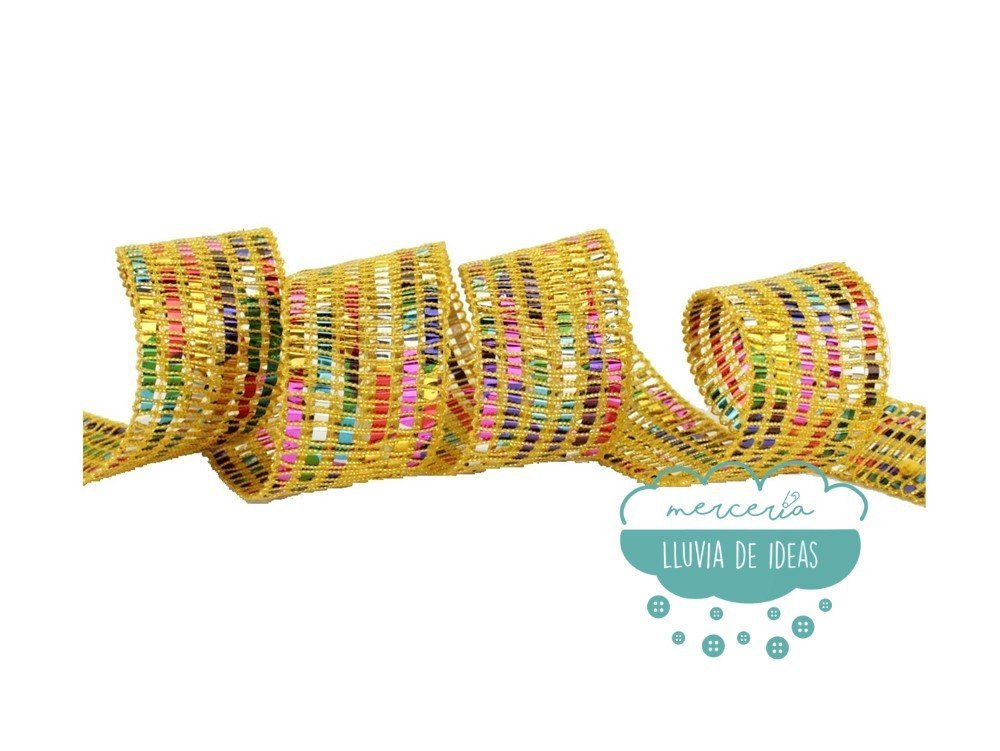 Pasamanería metalizada con cordoncillo de lúrex y láminas de acetato multicolor. Aporta brillo y color a tus confecciones.