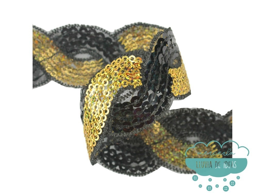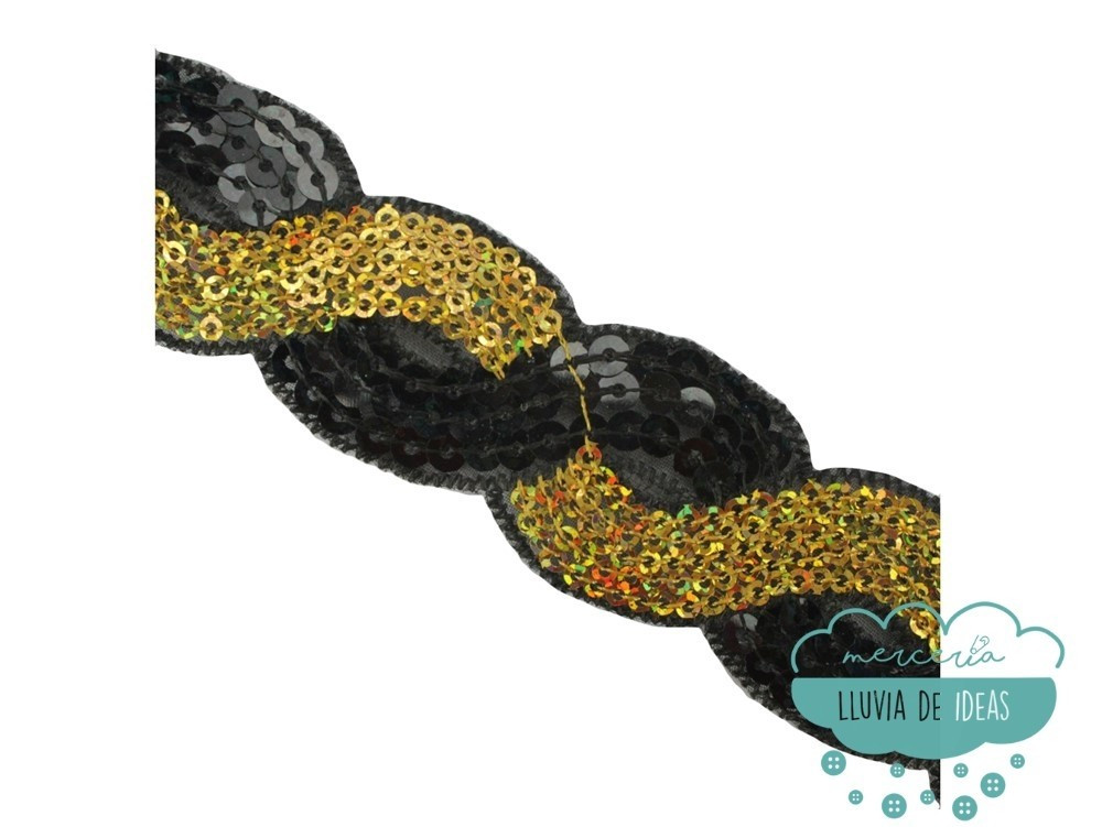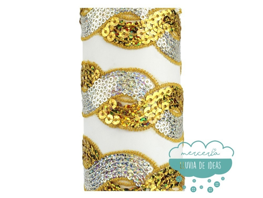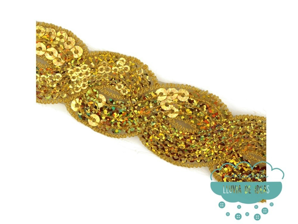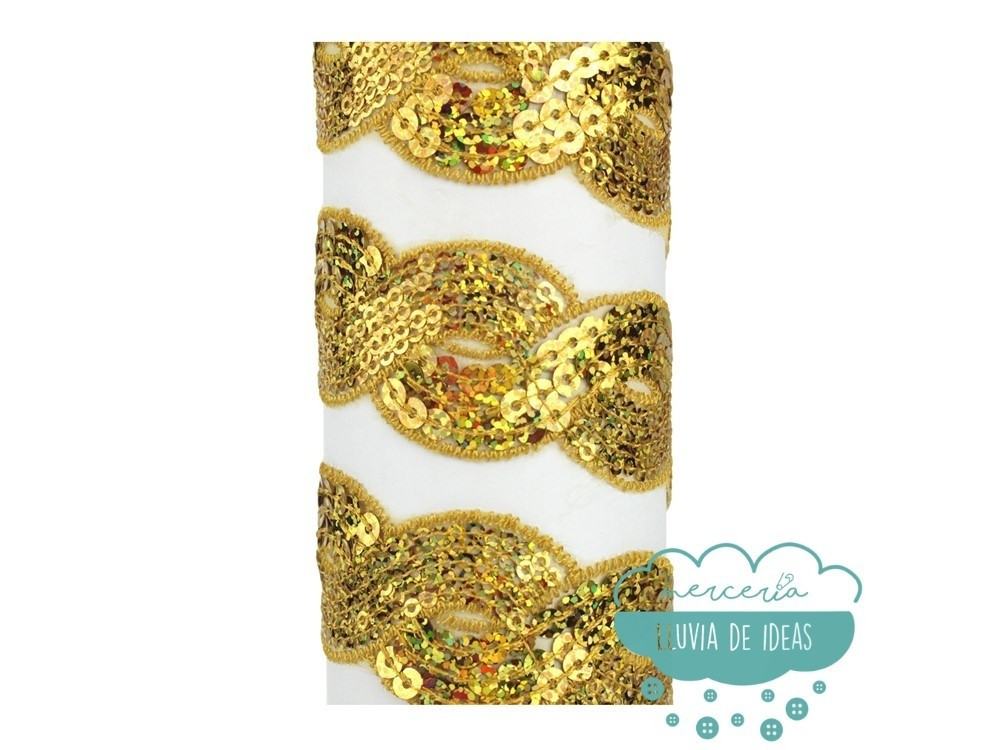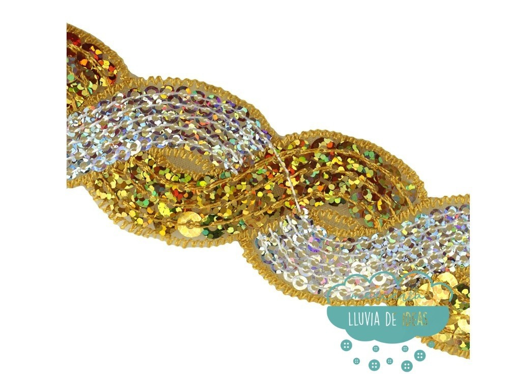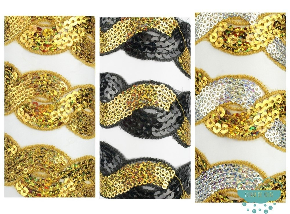 Pasamanería con lentejuelas de trenza. Aporta brillo a tus confecciones. Perfecta tanto para usar en vertical como en horizontal. Referencia: 460301. Ancho: 30 mm. aprox. Composición: PVC y Poliéster. El precio se refiere al metro lineal. El corte mínimo son 0.25 m. y a partir de ahí, en incrementos de 5 cm. (0.25, 0.30, 0.35...).