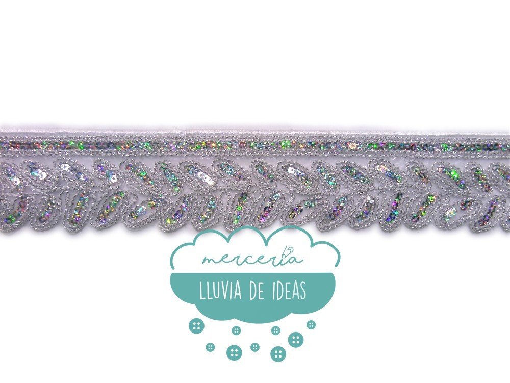 Pasamanería termoadhesiva de hojas con lentejuelas holográficas. Contiene orillo bordado e hilo de lúrex. Aporta brillo y luminosidad a tus confecciones.