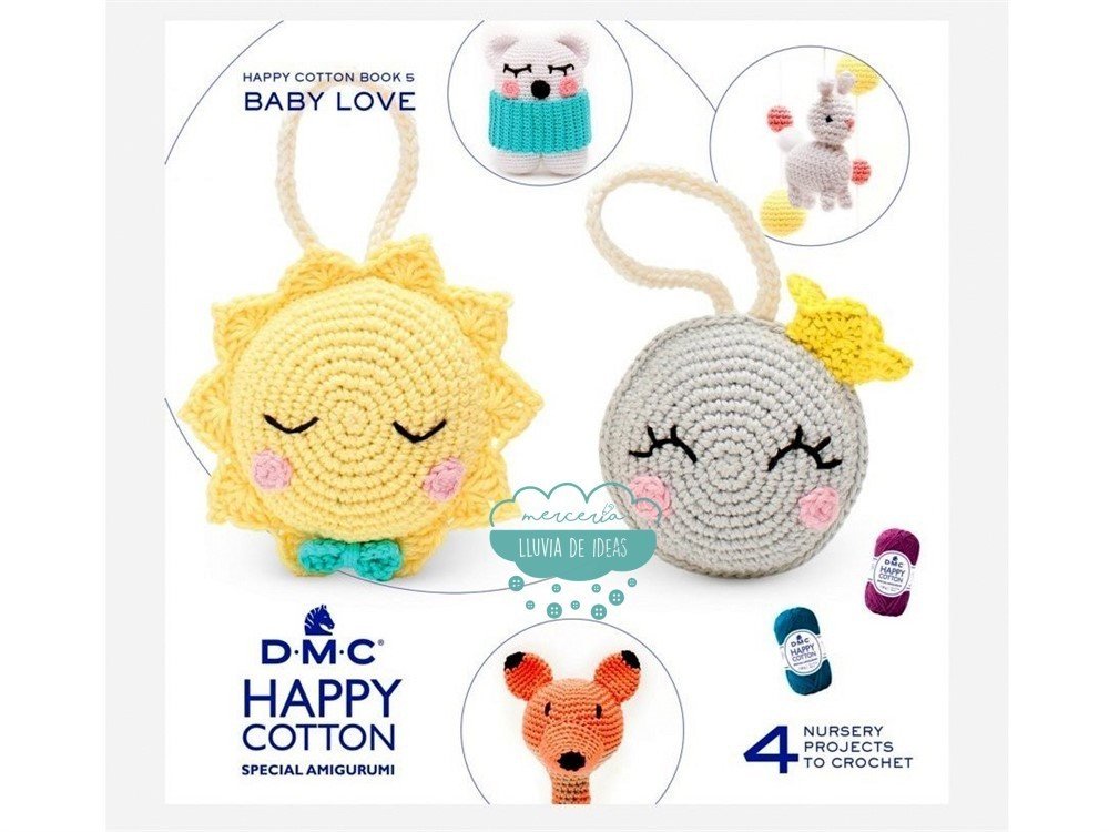 Edición especial de mini libros para la creación de Amigurumis. Contiene todas las instrucciones y gráficos necesarios explicados paso a paso para poder realizar los 4 modelos de amigurumis que puedes ver en las imágenes del producto. Teje amigurumis llenos de amor para el bebé: el sol, la luna, un móvil para la cuna o un sonajero de ganchillo. Emplea el nuevo hilo de algodón Happy Cotton de DMC presentados en mini ovillos de 20 gramos con un total de 50 colores a escoger para tus proyectos.