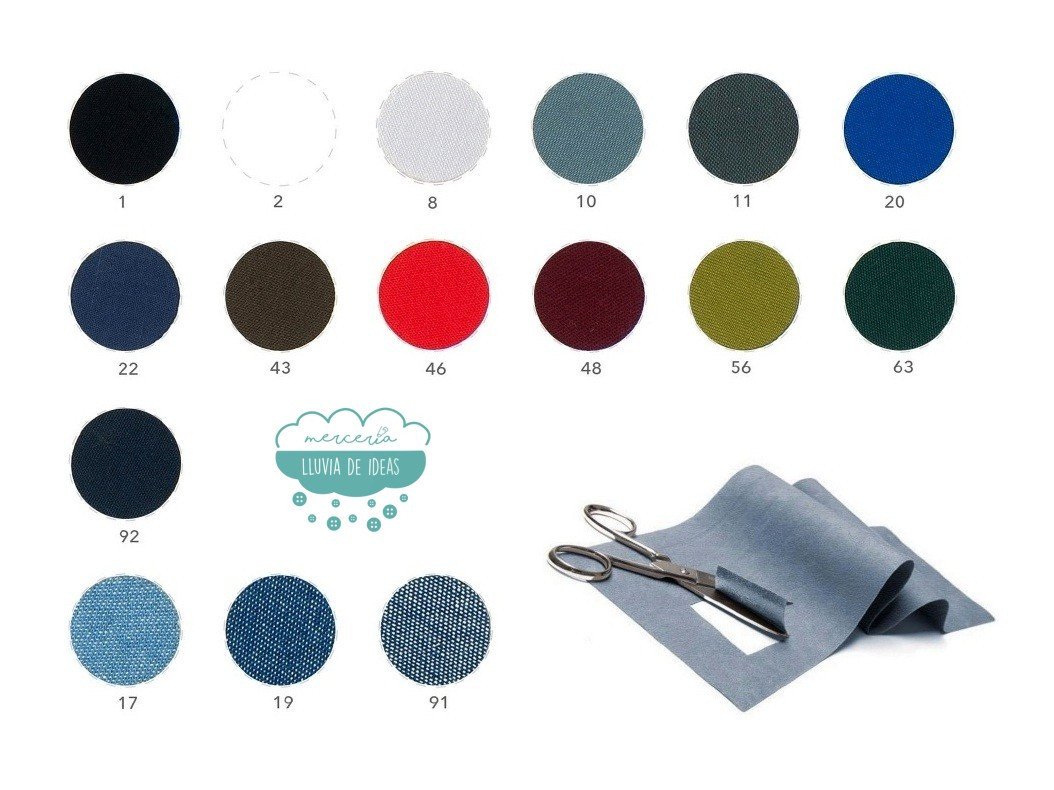 Se presenta en dos calidades: popelín en los colores blanco, negro y marino, y en tejido vaquero el color tejano.