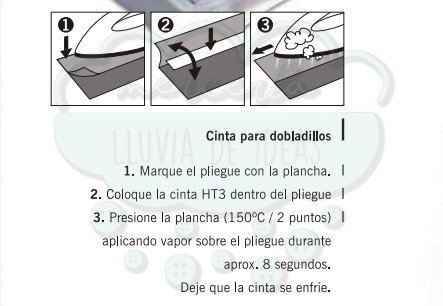 Cinta adhesiva (doble cara) para aplicar con plancha. Podrás realizar dobladillos, subir bajos o ajustar el largo de visillos y cortinas de forma rápida y sencilla con el calor de la plancha y sin necesidad de coser, ¡solo planchando! La cinta es adhesiva y ultrafina, de 3 cm. de ancho por 10 metros de largo.