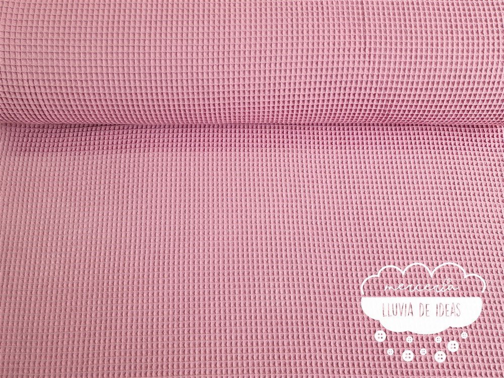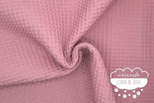 Tela de piqué waffle rosa empolvado o gofre indicado para la confección de prendas, y accesorios o complementos tanto de niños como de adultos. Con este tejido podrás crear infinidad de proyectos como arrullos, neceseres, cambiadores, colchas, baberos, bermudas, vestidos, cojines, etc. Tejido agradable al tacto, suave y esponjoso. Contiene una trama en relieve que recuerda al cuadro que conforman los gofres, de ahí su nombre en inglés "waffle".