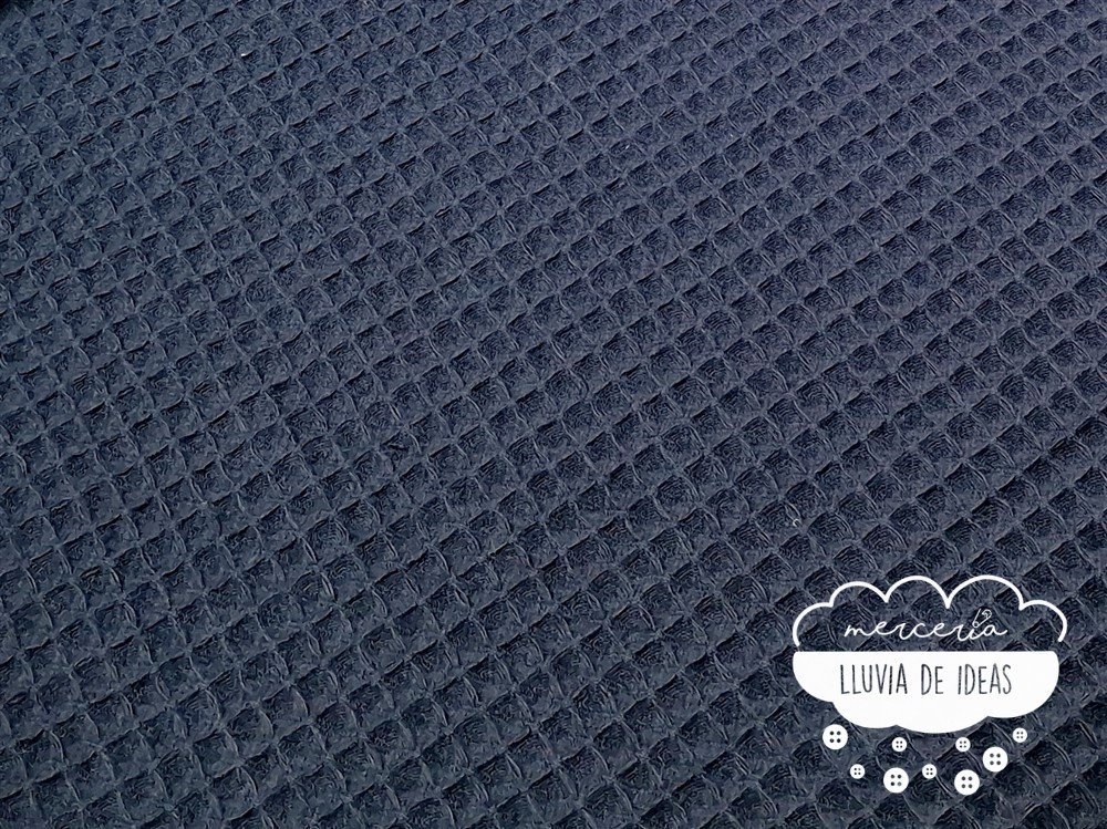 Tela de piqué waffle marino o gofre indicado para la confección de prendas, y accesorios o complementos tanto de niños como de adultos. Con este tejido podrás crear infinidad de proyectos como arrullos, neceseres, cambiadores, colchas, baberos, bermudas, vestidos, cojines, etc. Tejido agradable al tacto, suave y esponjoso. Contiene una trama en relieve que recuerda al cuadro que conforman los gofres, de ahí su nombre en inglés "waffle".