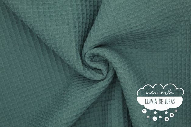 Tela de piqué waffle verde petróleo claro o gofre indicado para la confección de prendas, y accesorios o complementos tanto de niños como de adultos. Con este tejido podrás crear infinidad de proyectos como arrullos, neceseres, cambiadores, colchas, baberos, bermudas, vestidos, cojines, etc. Tejido agradable al tacto, suave y esponjoso. Contiene una trama en relieve que recuerda al cuadro que conforman los gofres, de ahí su nombre en inglés "waffle".