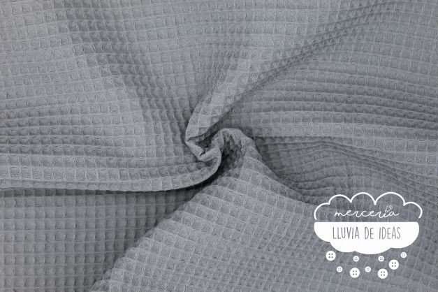 Tela de piqué waffle gris medio o gofre indicado para la confección de prendas, y accesorios o complementos tanto de niños como de adultos. Con este tejido podrás crear infinidad de proyectos como arrullos, neceseres, cambiadores, colchas, baberos, bermudas, vestidos, cojines, etc. Tejido agradable al tacto, suave y esponjoso. Contiene una trama en relieve que recuerda al cuadro que conforman los gofres, de ahí su nombre en inglés "waffle".