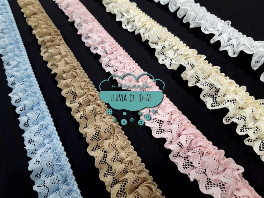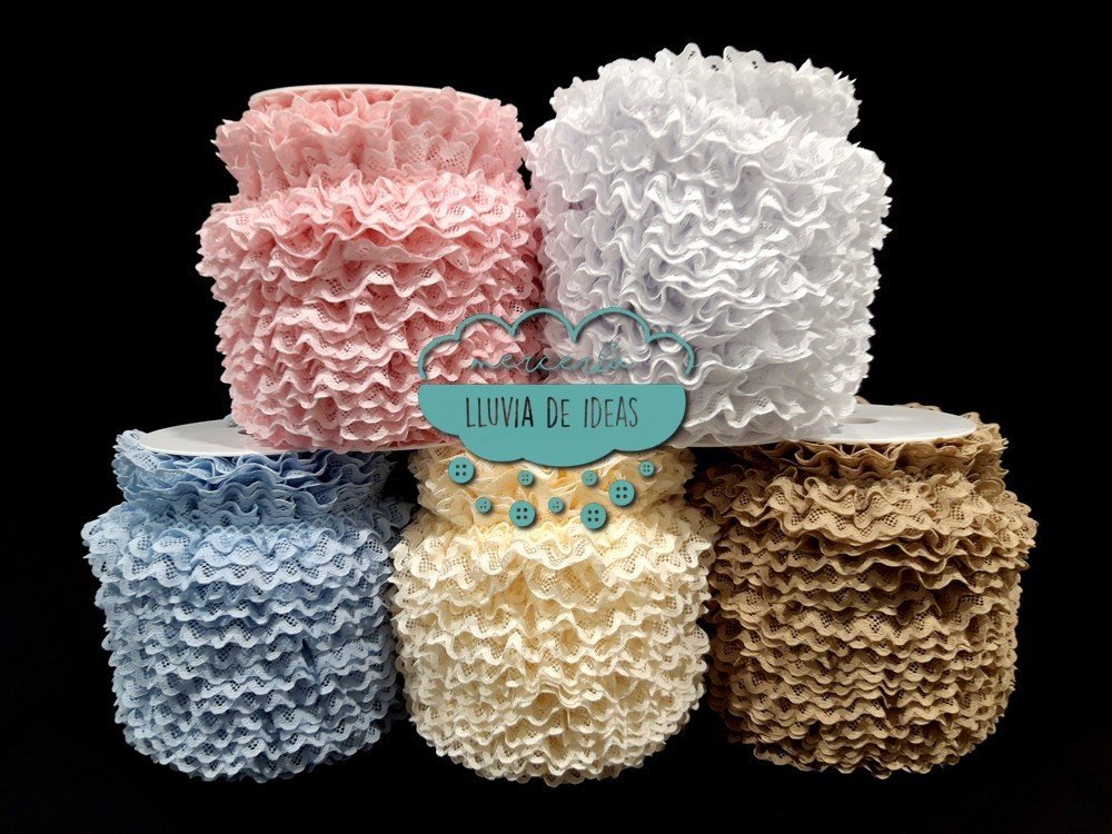 Triple puntilla fruncida a una base de lazo de raso de 6 mm. aprox. (prácticamente inapreciable a la vista) en colores lisos. Las puntillas contienen topos y finalizan en ondas. Referencia: 245083. Tamaño: ancho 35 mm. aprox. Composición: 100% poliamida. El precio se refiere al metro lineal. El corte mínimo son 0.25 m. y a partir de ahí, en incrementos de 5 cm. (0.30, 0.35, 0.40...).