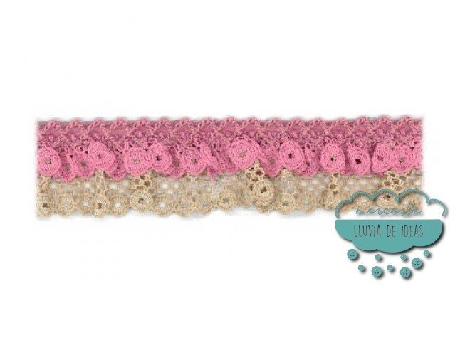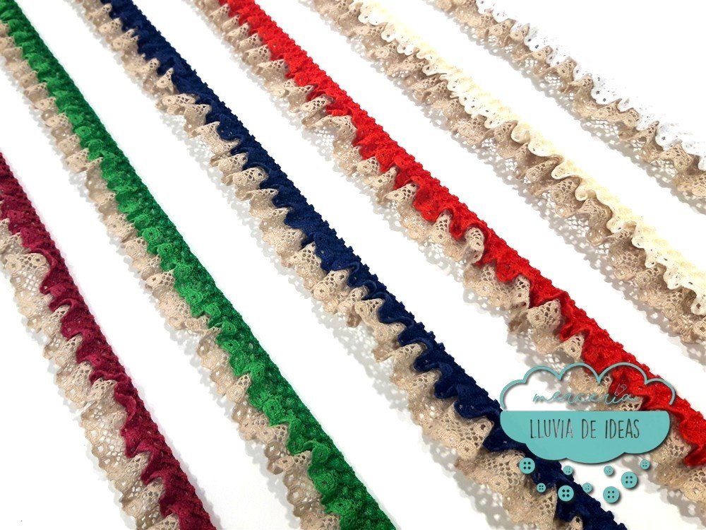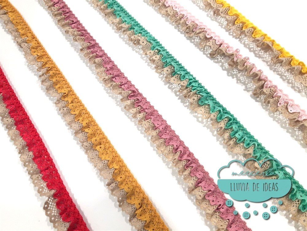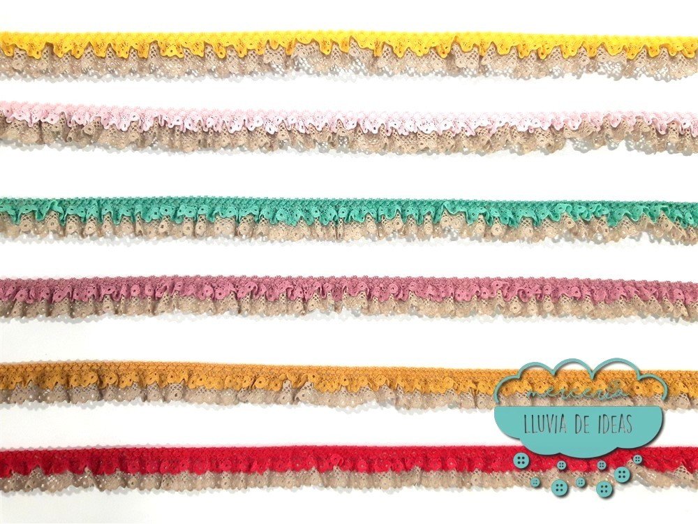Doble puntilla fruncida a una base de lazo de raso de 6 mm. aprox. (prácticamente inapreciable a la vista) en colores lisos. La puntilla más ancha es en tono beige tostado, variando el tono de la puntilla más estrecha. Son caladas tipo encaje y finalizan en onda (círculos).