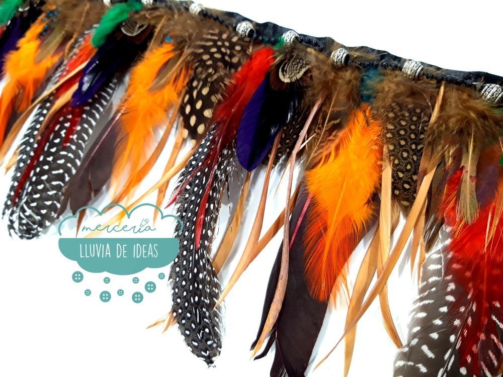 Fleco de pluma de colores con abalorios por metros. Combina diferentes tipos de plumas, colores y largos consiguiendo un efecto divertido. Ideal para customizar vestidos, bolsos, capazos, cazadoras, botas, collares, etc. y manualidades en general.