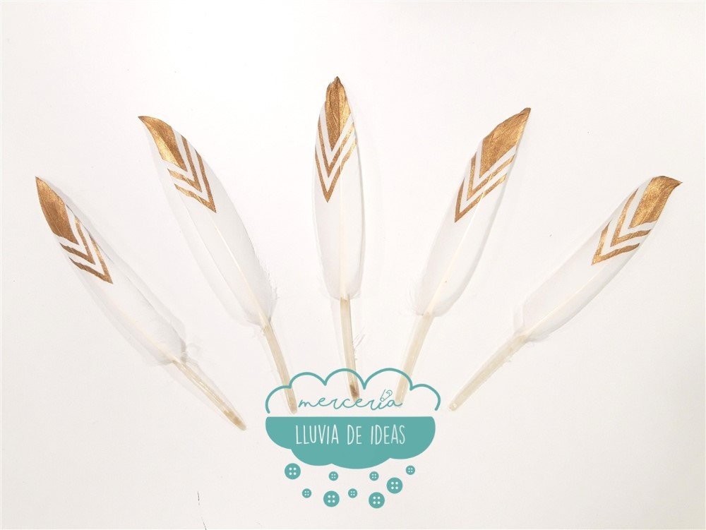 Plumas sueltas de pato blancas con punta y zig zag dorado pintadas a mano. Ideal para customizar decoraciones de boda, tocados, sombreros, collares, bolsos, etc. y manualidades en general.