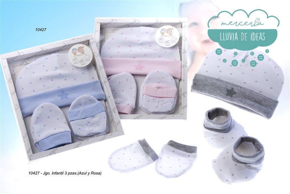 Juego infantil de primera puesta compuesto por manoplas, patucos y gorrito de punto. Ideal como regalo para el recién nacido. Estas prendas evitan que los bebés pierdan su temperatura corporal.