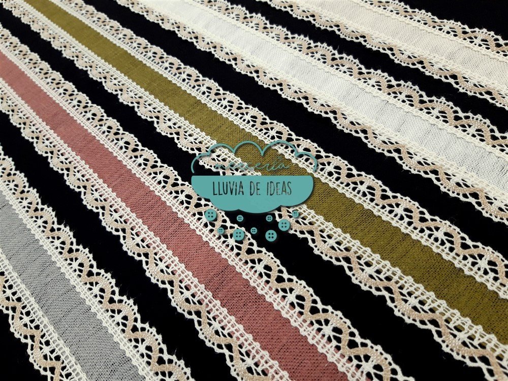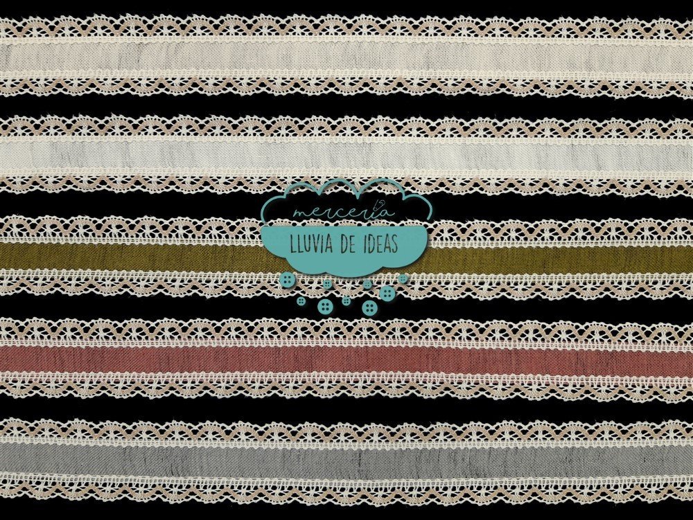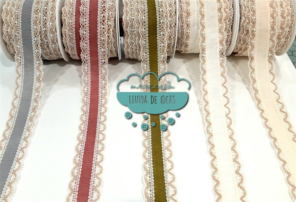 Entredós con tira central de lino en diferentes colores lisos decorado con puntillas de bolillos bicolores (crudo y tostado) en sus laterales. Referencia: 145188. Tamaño: ancho total 45 mm. aprox. (incluyendo puntillas laterales). Ancho cenefa central lino: 25 mm. aprox. Composición: mezcla lino, algodón y poliéster. El precio se refiere al metro lineal. El corte mínimo son 0.25 m. y a partir de ahí, en incrementos de 5 cm. (0.30, 0.35, 0.40...).
