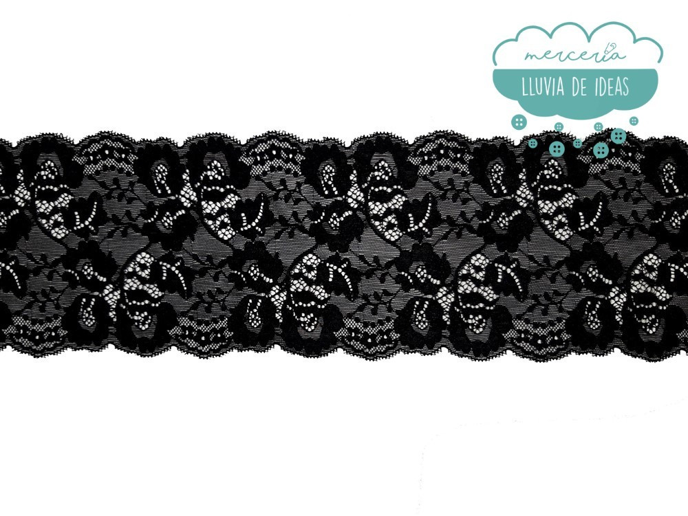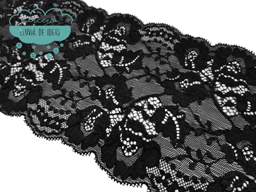 Tira de encaje elástica en color negro muy suave al tacto. Empleada principalmente para alargar prendas que quedan cortas como camisetas y jerséis, bajos de vestidos o faldas, etc. También para añadir mangas postizas o disimular brazo en vestidos y cuerpos o como elemento decorativo (grecas tanto verticales como horizontales). Referencia: 541409. Composición: nylon + elastán. Ancho: 14,5 cm. aprox. El precio se refiere al metro lineal. El corte mínimo son 0.25 m. y a partir de ahí, en incrementos de 5 cm. (0.30, 0.35, 0.40...).