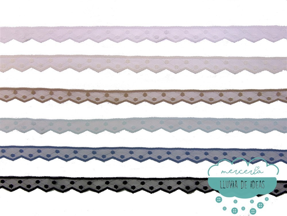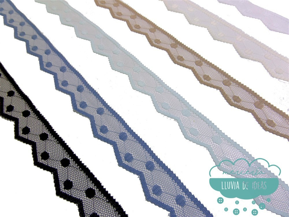 Puntilla de nylon con lunares y borde rematado en picos. La base de la puntilla es tipo tul. Referencia: 45663 (blanco). Tamaño: ancho 28 mm. aprox. Composición: 100% poliéster. El precio se refiere al metro lineal.