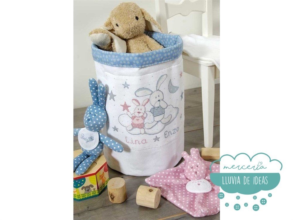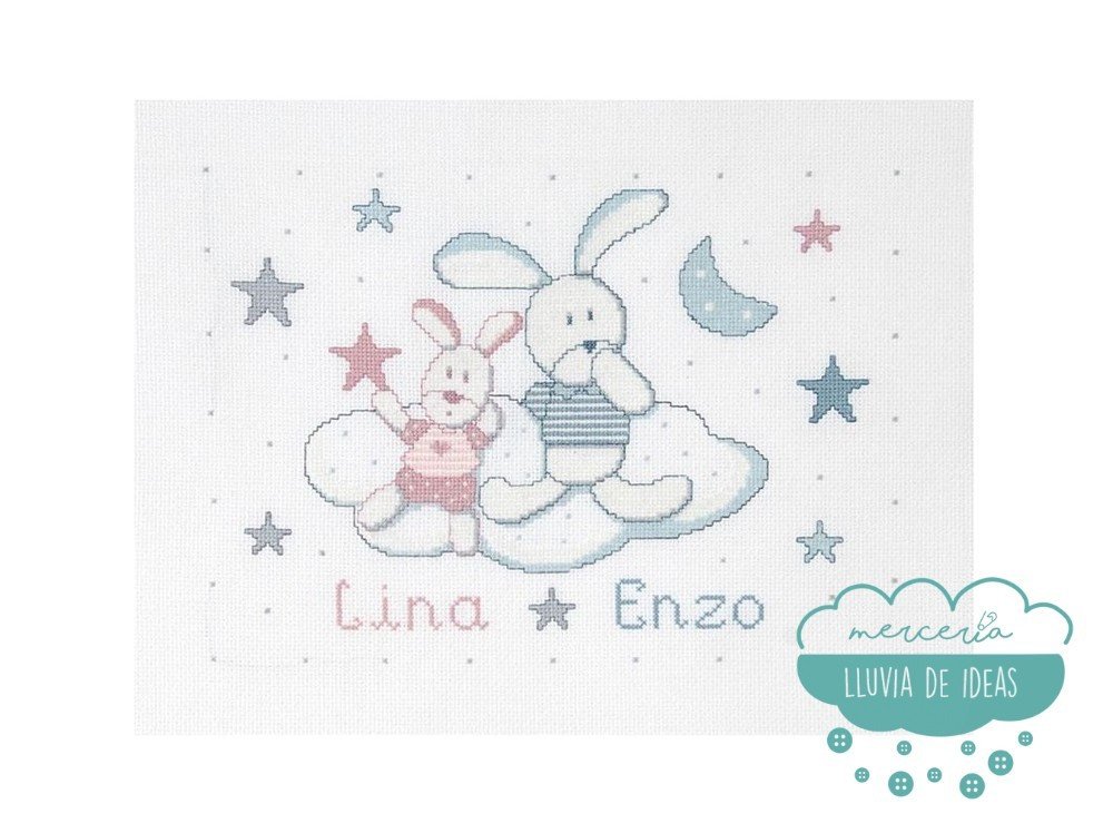 Kit completo de punto de cruz de la casa DMC. Incluye los hilos mouliné necesarios, tela aída blanca de algodón de 5,5 pts/cm., aguja para bordar, diagrama del modelo de conejitos y diagrama de abecedario completo e instrucciones en castellano entre otros idiomas. Referencia: BK1620. Tamaño : 30x21,5 cm. aprox. Nivel de dificultad: fácil. El precio se refiere a la unidad (kit).