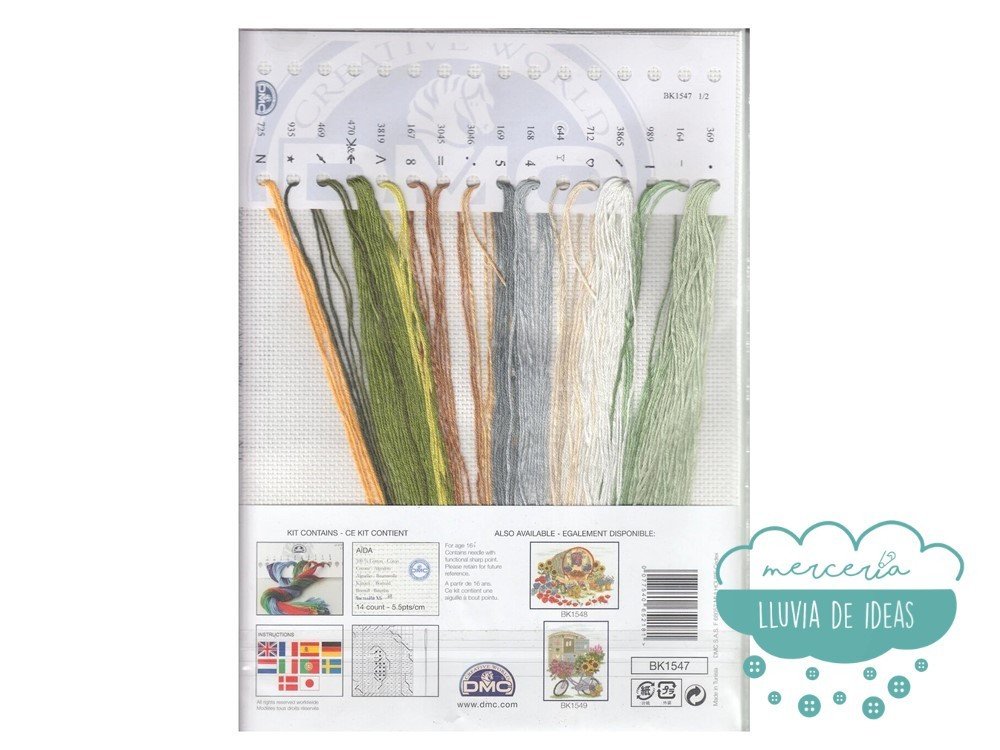 Kit completo de punto de cruz de la casa DMC. Incluye los hilos mouliné necesarios, tela aída blanca de algodón de 5,5 pts/cm., aguja para bordar, diagrama del modelo e instrucciones en castellano entre otros idiomas.