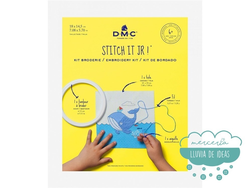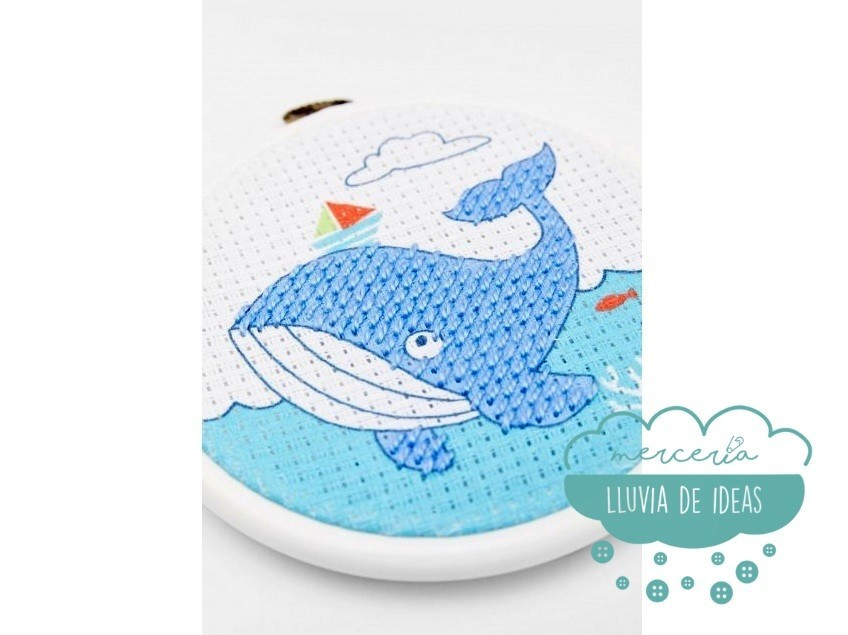 Kit creativo de bordado a medio punto con estampación de ballena. Nivel fácil, recomendado a partir de 6 años.