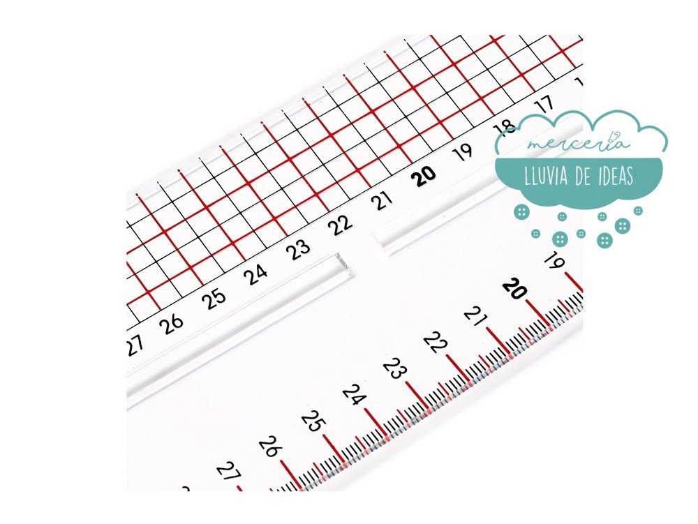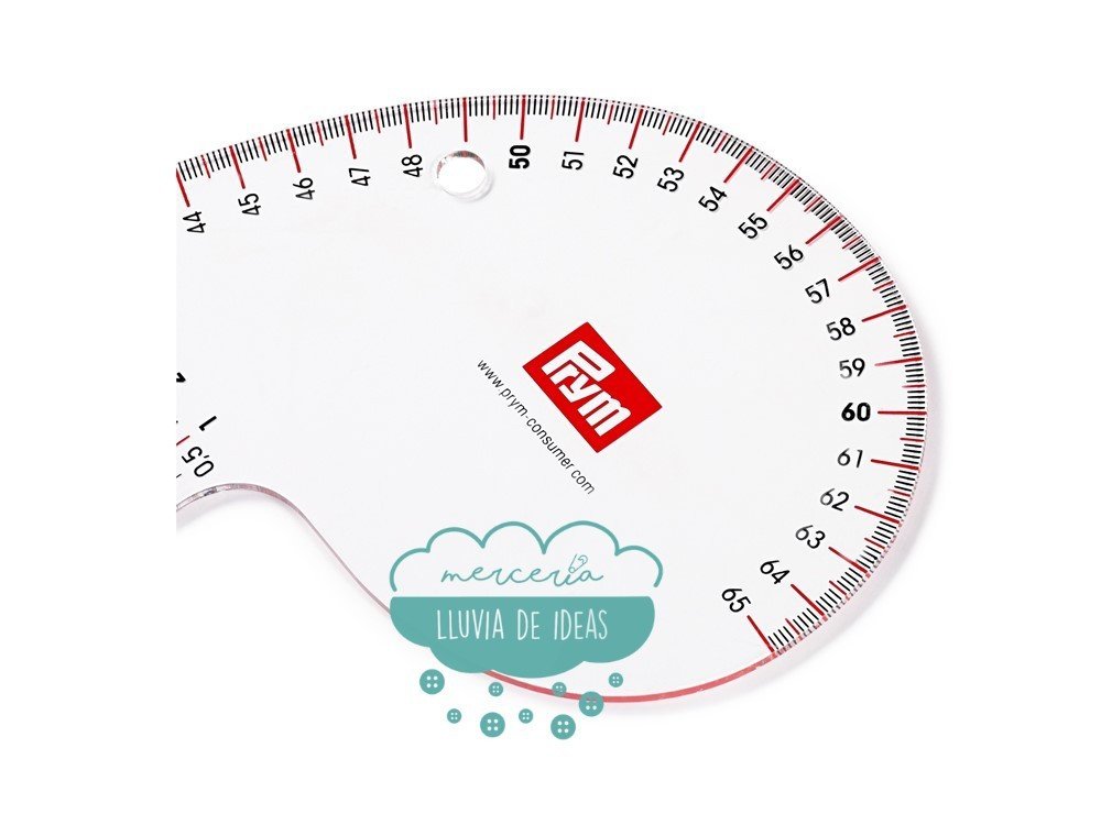 Regla curva multifunción. Marcada en sistema métrico (cm. y mm.). La parte recta en una escala de 2.5 x 40 cm. permite una perfecta transferencia de ojales y costuras, mientras que la parte redondeada de 65 cm. es ideal para transferir todas las curvas y formas redondeadas.