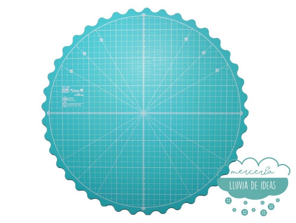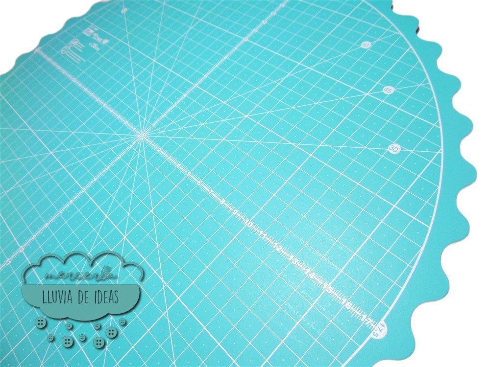 Alfombrilla de corte giratoria en color turquesa con revestimiento trasero antideslizante. Incluye ondas en su contorno para girar la base con mayor facilidad. Se emplea como base para cortar empleando cúter circular o rotativo. Indica medida en centímetros, cuadrículas y diferentes tamaños de ángulos.
