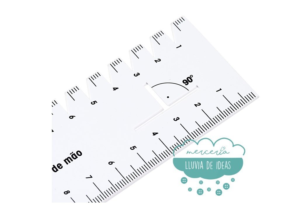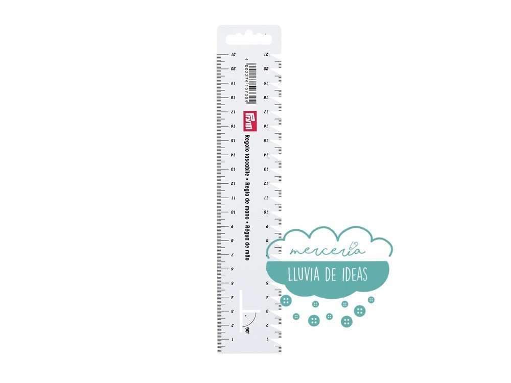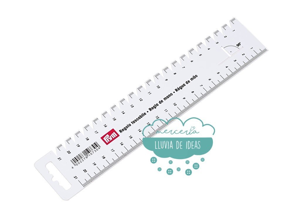 Regla de mano muy manejable por su tamaño y flexible. Muy práctica para medir costuras, ojales y dobladillos. Marcada en sistema métrico (cm. y mm.).