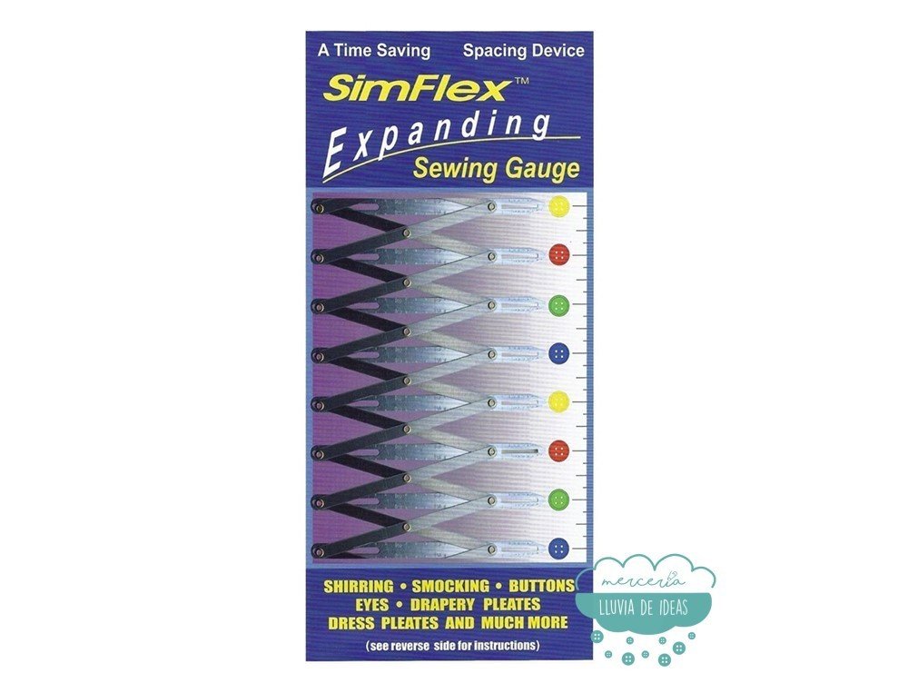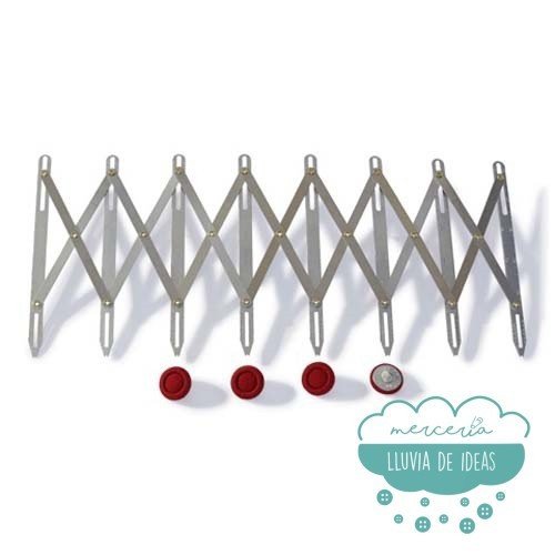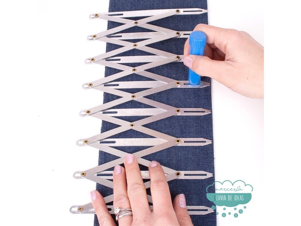 Regulador metálico para marcar medidas de forma proporcional, tales como frunces, ojales, colocación de botones, pliegues de cortinas o faldas, y diversos usos en costura o patchwork, manualidades, etc. También usado en otras ramas como jardinería o repostería.