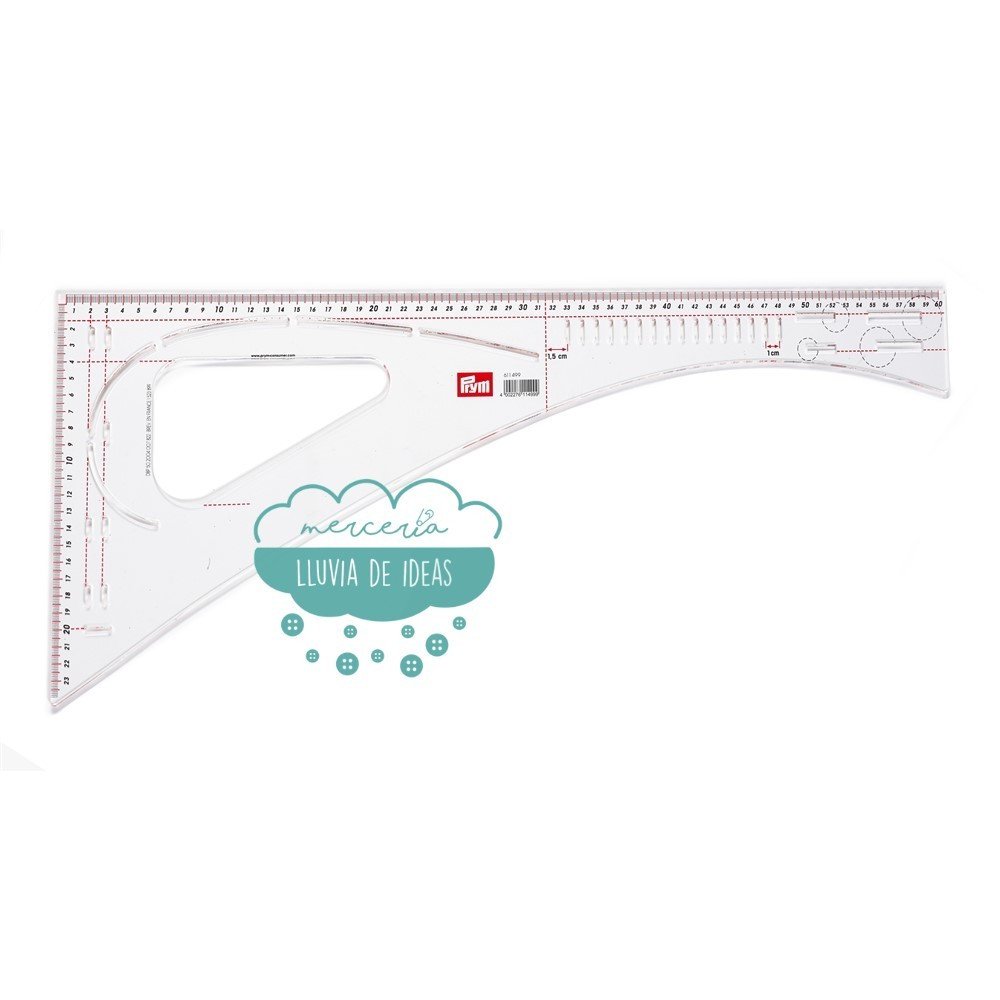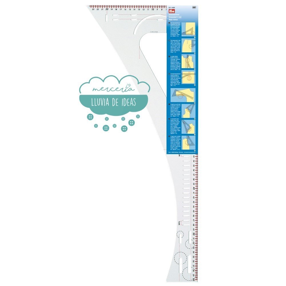 Regla de costura con medición en sentido vertical y horizontal. Ofrece gran cantidad de funciones para crear patrones y marcar en tejidos, muy útil tanto para sastre o modista como para aficionados. Con esta escuadra multifuncional se pueden dibujar fácilmente medidas repetitivas, como dobladillos, ojales o pliegues, también para determinar ángulos de 45 y 90º. El marcar la sisa, la cintura, el cuello y las caderas tampoco son un problema gracias a su borde interior curvado. En los bordes exteriores rectos encontrarás una escala de 60 cm. y 24 cm. bien marcados y fáciles de leer. Contiene ranuras paralelas para marcar de forma inmediata y precisa ojales a la misma distancia y también incluye diferentes tamaños de ojales con el dibujo del botón necesario como guía.