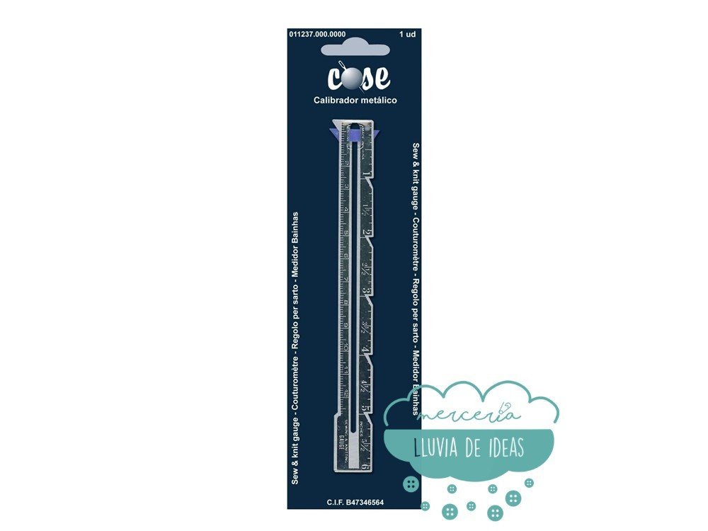Puntímetro o regla calibradora de costuras, provista de un indicador deslizable de plástico, muy útil para detalles precisos. En costura permite aumentar o disminuir los márgenes de costura a todo el contorno de las piezas de la prenda o patrones. También para medir dobladillos. Su extremo en punta sirve además para sacar esquinas cuando volteas la labor al derechas. En labores de punto permite contar las vueltas necesarias para cubrir una determinada medida. En este instrumento se puede ajustar, comprobar y marcar cualquier medida; también ideal para marcar con rapidez marcar con rapidez círculos y distancias entre ojales. Incluye medidas en centímetros (hasta 13,7 cm.) y también en pulgadas (hasta 6"). Referencia: 011237. Material: metal. Medida total: ancho 1,7 cm. x largo 15,4 cm. aprox. Presentación en blíster. El precio se refiere a la unidad.