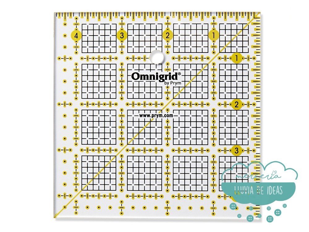 Regla omnidireccional transparente con escala en centímetros y pulgadas. Incluye marcas de rejilla negras y amarillas que permiten marcar con precisión en telas tanto oscuras como claras. Muy empleada en patchwork para conseguir patrones con diferentes formas, con ángulos marcados para cortar a 45º. Sus líneas laterales pueden emplearse como márgenes de costura. Sirve además como guía para cúter circular de forma segura. La impresión láser resistente a los arañazos en la parte inferior de la regla evita la distorsión visual. Incluye guía visual de usos.