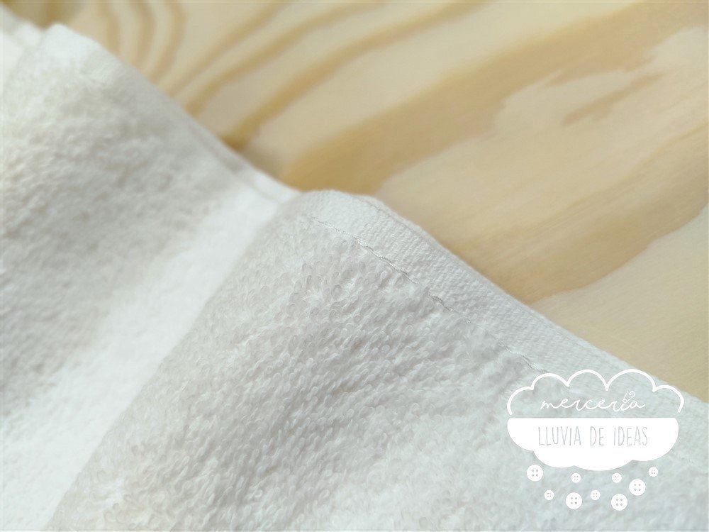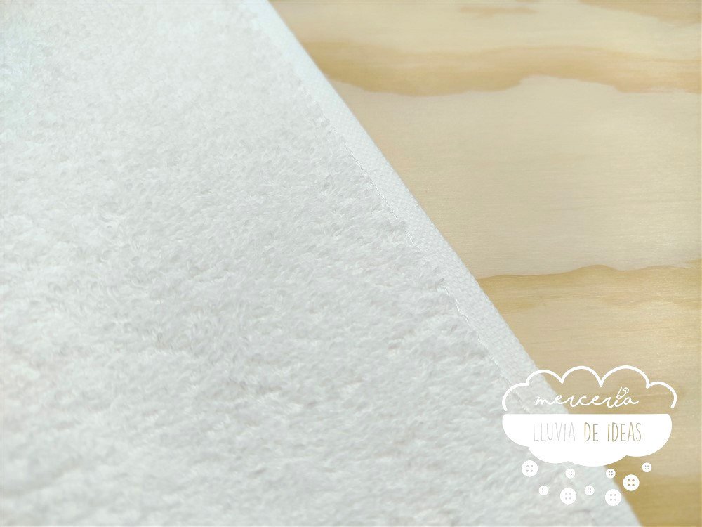 Rizo toalla blanco 100% algodón. También llamado felpa o tela de toalla, de rizo americano, con mucho cuerpo, de tacto agradable. Gruesa y esponjosa. Es ideal para confeccionar toallas, arrullos y capas de baño, baberos, cambiadores, trapos de cocina, protectores, albornoces, etc.