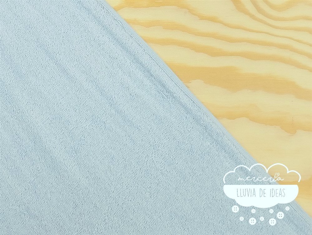 Rizo toalla azul bebé 100% algodón. También llamado felpa o tela de toalla, de rizo americano, con mucho cuerpo, de tacto agradable. Gruesa y esponjosa. Viene rematada en los orillos. Es ideal para confeccionar toallas, arrullos y capas de baño, baberos, cambiadores, trapos de cocina, protectores, albornoces, etc.
