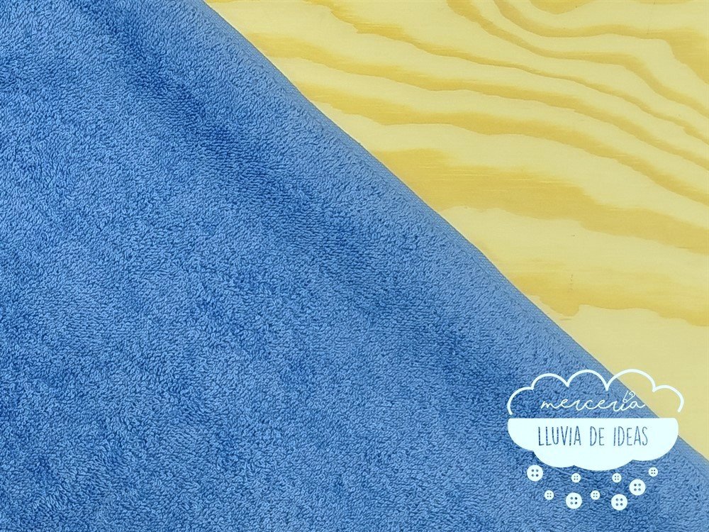 Rizo toalla azul vaquero 100% algodón. También llamado felpa o tela de toalla, de rizo americano, con mucho cuerpo, de tacto agradable. Gruesa y esponjosa. Viene rematada en los orillos. Es ideal para confeccionar toallas, arrullos y capas de baño, baberos, cambiadores, trapos de cocina, protectores, albornoces, etc.